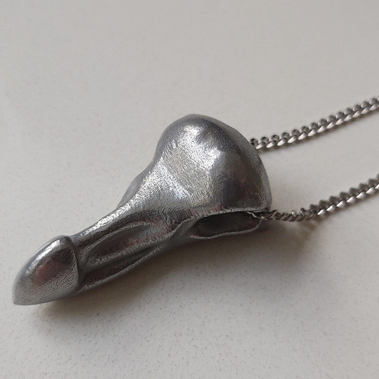 A unique sculptured and 'streamlined' pendant design, 3D printed in aluminium and available in several finishes - Antiqued Gothic Gloss or High Gloss with 'micro' texture. This design threads the chain through the eye socket recess, rather than a small loop at the back. The pendant is 48mm long (1.8 inches) and has a Gothic elegance but less weight than its stainless-steel counterpart.